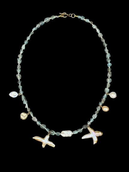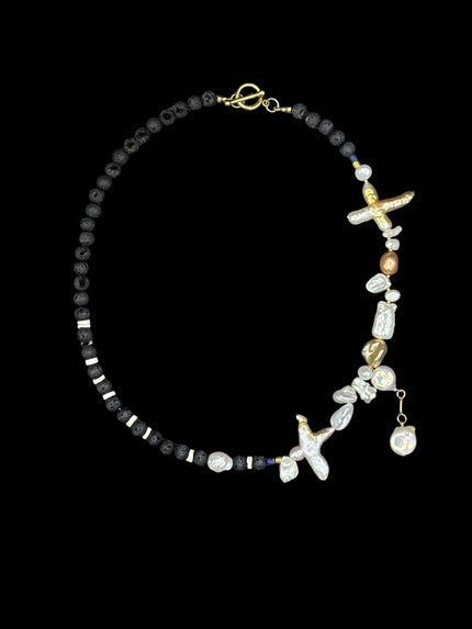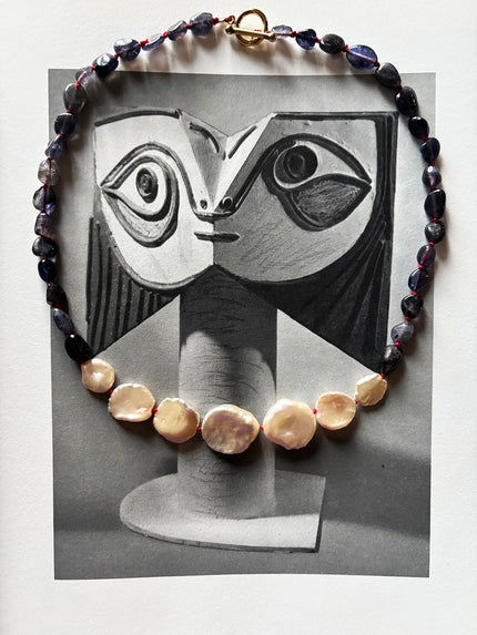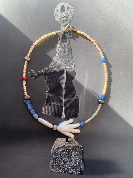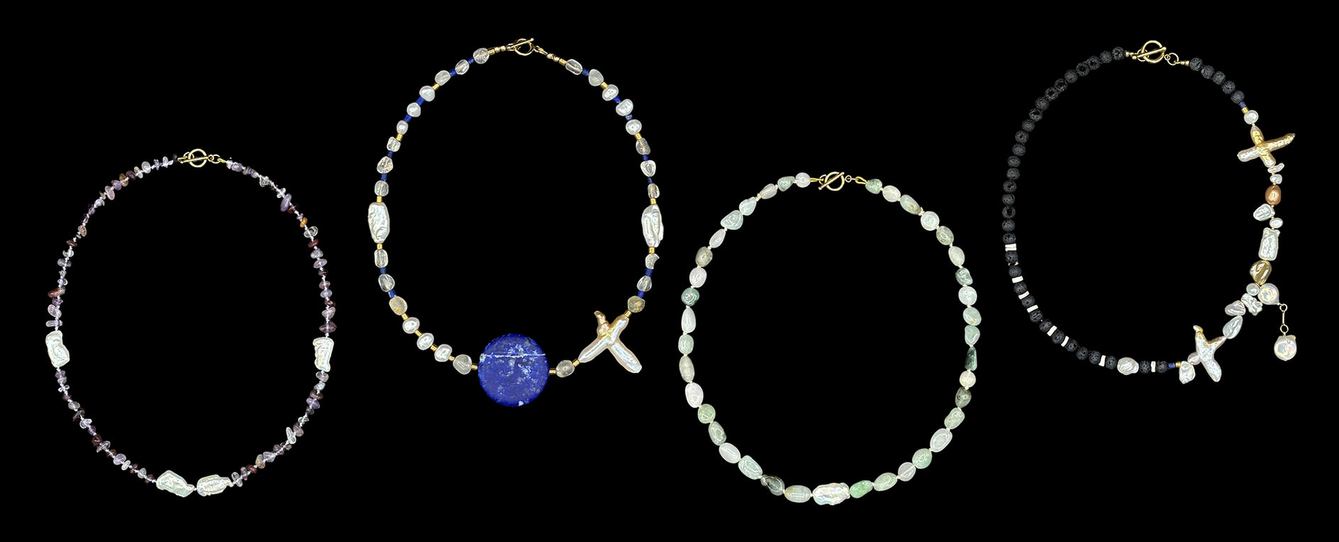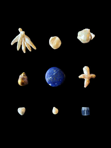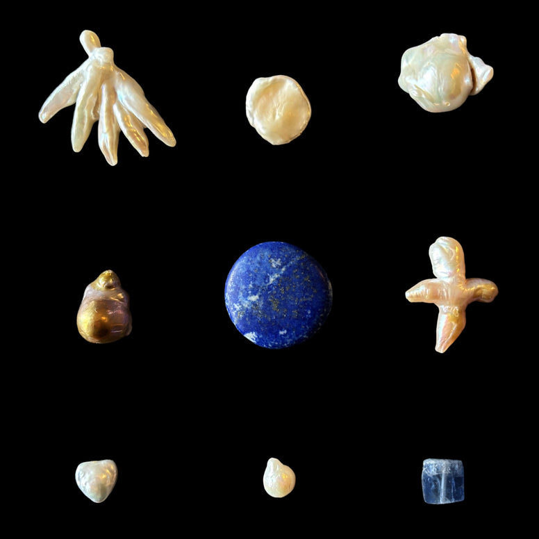 Each piece is composed individually, by hand, with deliberate attention to the singular character of every stone and pearl selected. The aesthetic is spare, painterly, and original — the quiet precision of the natural world distilled into something wearable, collectable, and wholly itself. Translucent gemstones and the iridescent, creamy luster of baroque freshwater pearl combine to create a radiant, sculptural quality — curatorial precision and quiet, irresistible poetry in equal measure.